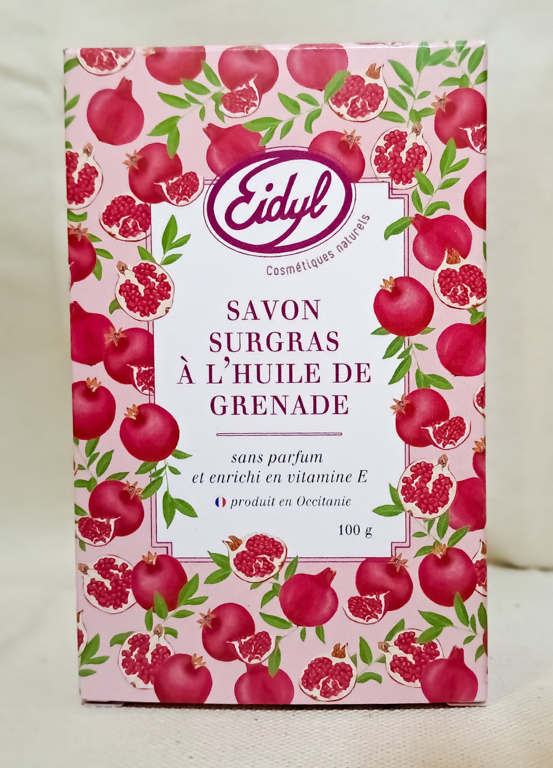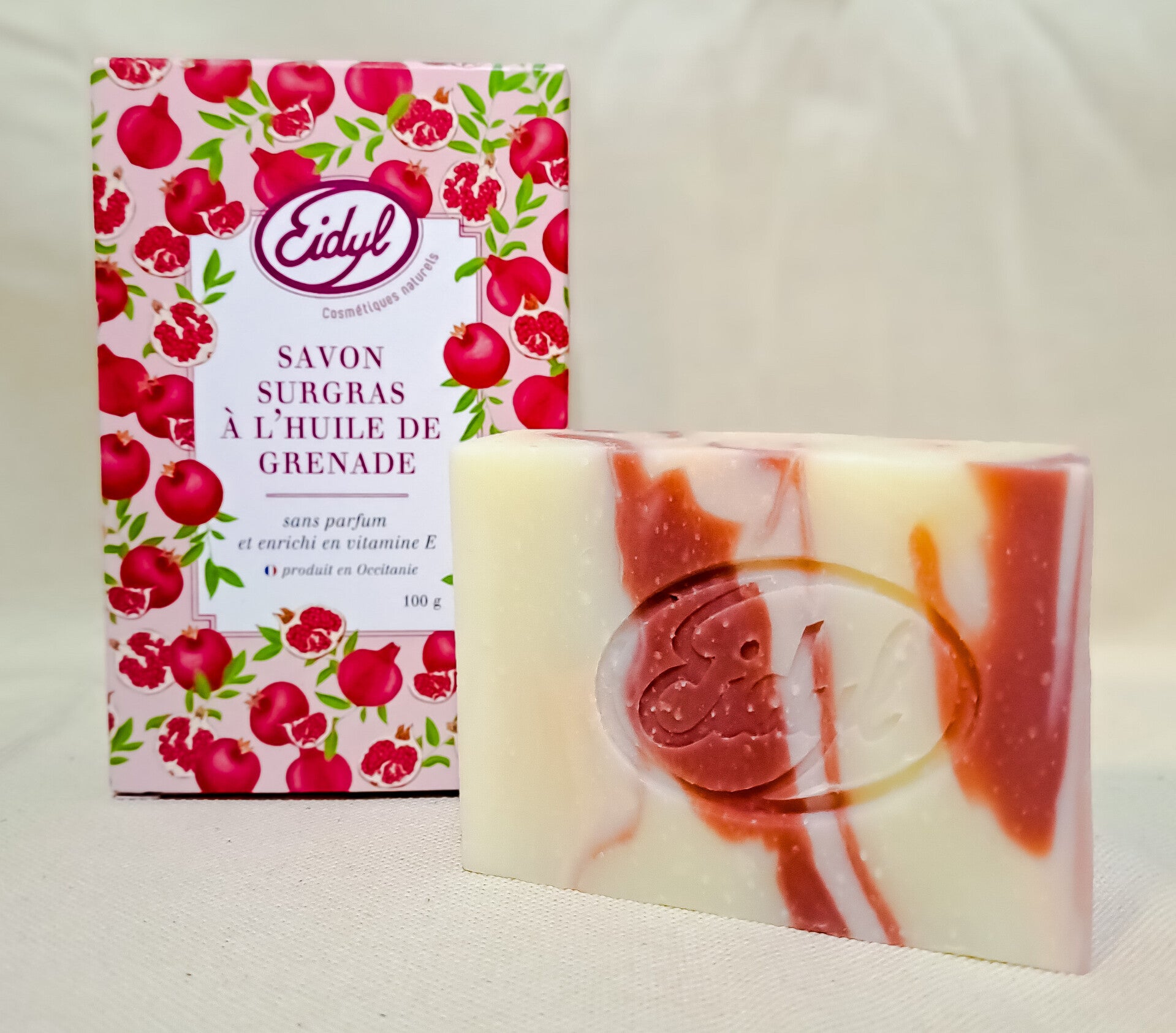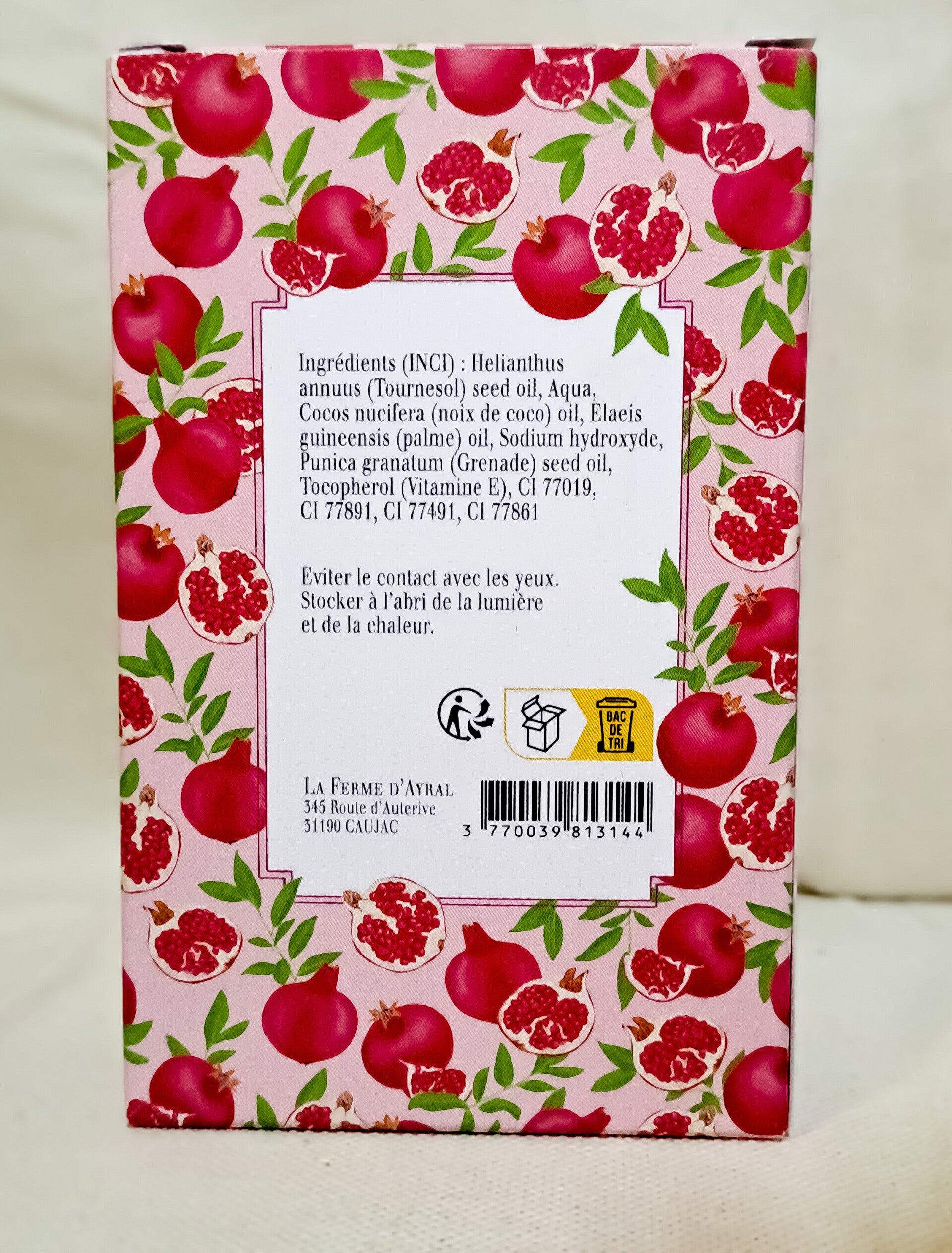 Ingrédients (INCI): Helianthus annuus (tournesol) seed oil, Aqua, Cocos nucifera (noix de coco) oil, Elaeis guineensis (palme) oil, Sodium hydroxide, Punica granatum (Grenade) seed oil, Tocopherol (Vitamine E), CI77019, CI77891, CI77491, CI77861